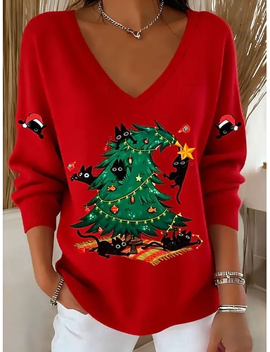 Per donna Felpa Maglione Moda Streetwear Casual Grafico Animale Albero di Natale Scollo a V Oversize Lavorato a maglia Manica Lunga Top Regolari Maglia All'aperto Quotidiano Rosso Primavera Autunno