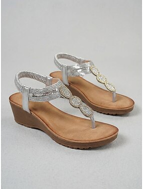 Sandali con zeppa da donna color argento glitterato con cinturini metallici alla caviglia – per le vacanze &scarpe da sera da resort
