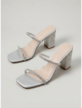Sandali da donna con tacco a blocco e strass argentati, scarpe eleganti minimaliste con tacco grosso e cinturini per cocktail party e balli di fine anno. &eventi serali