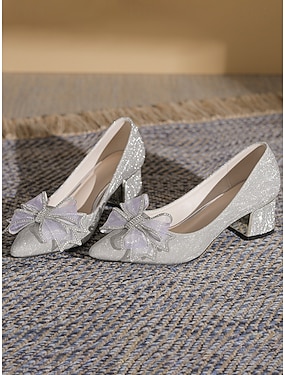 tacchi alti da donna con fiocco glitterato argento, tacchi a spillo da sposa di lusso per la cerimonia nuziale in chiesa della sposa