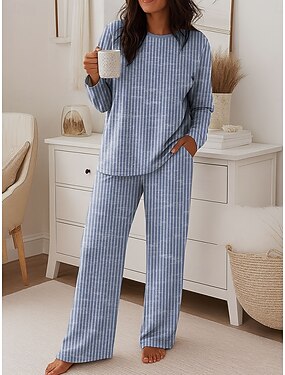Per donna Elegante Vintage Quotidiano Set di Pantaloni Manica Lunga Girocollo A righe Patchwork Vacanza Lavoro Casuale Blu Primavera Vestibilità comoda