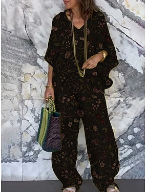 Per donna Vacanza Moda Set di Pantaloni Manica 3/4 Scollo a V Floreale Stampato Vacanza Quotidiano Ferie Nero Estate Vestibilità regolare