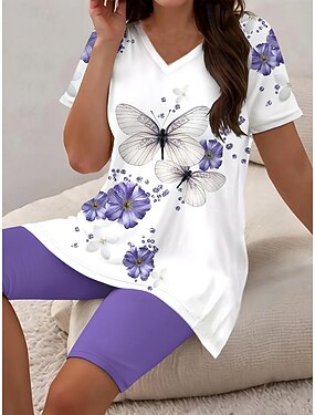 Per donna Moda Quotidiano Maglietta Set di Pantaloncini Manica Corta Scollo a V Ombre Floreale Farfalla Stampato Quotidiano Casual Quotidiano Verde chiaro Uva Blu oceano Estate Vestibilità regolare