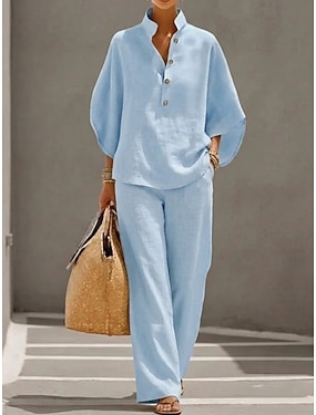 Per donna Camicia Set da due pezzi Finto cotone e lino Pantaloni di Lino Pantaloni Set Manica Lunga Scollo a V Tinta unica Coulisse Moda Streetwear Abbigliamento quotidiano Data Blu Nero Bianco