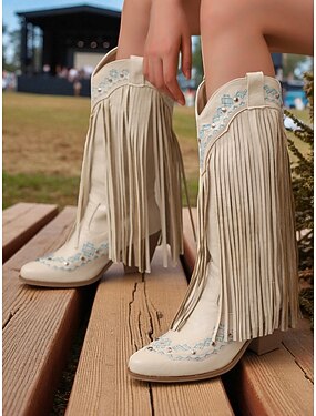 stivali da cowboy con frange western da donna: stivali alti fino al ginocchio in similpelle marrone con dettagli ricamati, stile country retrò per rodeo, festival autunnali e moda contadina