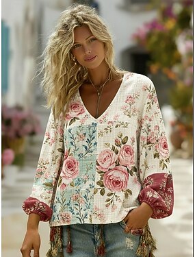 Per donna Camicia Camicia Boho Finto cotone e lino Stampato Floreale Grafico Bohemien Vintage Classico Manica Lunga Scollo a V Top Regolari Quotidiano Ferie Uscire Beige Estate Primavera Autunno