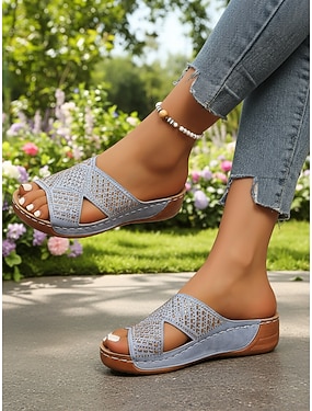 sandali con zeppa decorati con strass blu da donna, sandali casual e comodi per le vacanze, la spiaggia, il tempo libero a bordo piscina e lo stile quotidiano