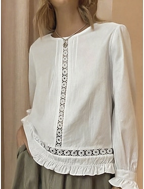 Per donna Top traforato Blusa Finto cotone e lino Arricciato Patchwork Traforato Tinta unica Semplice Elegante Signore Classico Manica Lunga Girocollo Top Regolari Quotidiano Lavoro Ferie Blu Nero