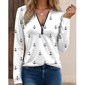 Maglietta da donna a maniche lunghe con zip a quarto Stile casual floreale scollo a V top regolari quotidiani bianchi rossi blu navy blu blu polvere estate
