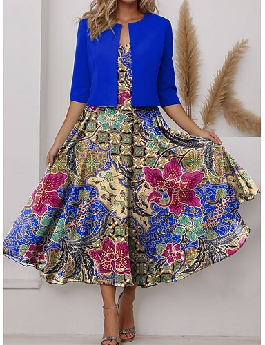 Set di abiti da donna a due pezzi abito midi con giacca abito elegante a linea maniche a ¾ casual semi formale stampa floreale ombre scollo a V data rosa blu viola vestibilità regolare