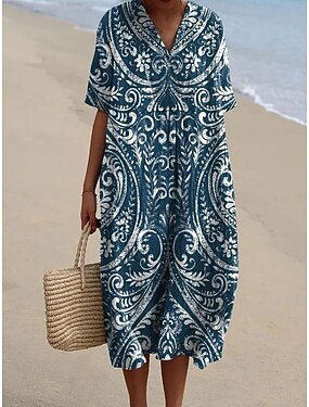 Per donna Abito Midi Vestito Estivo Abito a trapezio Vacanza Casual Spiaggia Feste Uscire Spiaggia Vestibilità comoda Floreale Grafico Tribale Manica Corta Scollo a V Blu Verde Estate Primavera