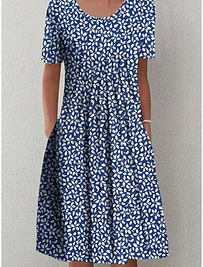 Abito Midi da donna Abito casual Blu Maniche corte Stampa Arricciata Primavera Estate Collo rotondo Casual 2023 S M L XL XXL 3XL