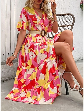 Per donna Vestito maxi Abito linea A Moda Manica a balze Giornaliero Standard Color Block Manica corta A V Rosso Estate