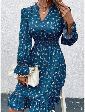 Per donna Mini Abito Abito aderente Abiti semi formali Ufficio Vestibilità regolare Floreale Grafico Manica Lunga Scollo a V Blu Bianco Rosso Cachi Primavera Autunno