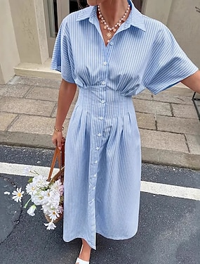 Per donna Abito Midi Vestito Casual Abito a trapezio Elegante Spiaggia Vestibilità regolare Grafico A righe Manica Corta Colletto a Camicia Blu Giallo Rosa Grigio Estate Primavera