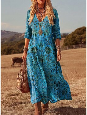 Abito maxi da donna in lino come traspirante leggero abito estivo abito a trapezio abito A-line per vacanze casual boho al mare per uscire floreale a 3/4 maniche girocollo blu bianco verde estate