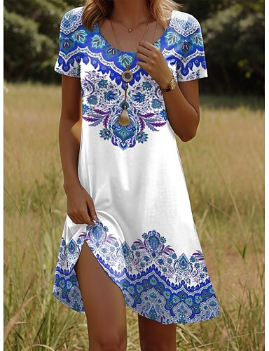 Abito Mini Femminile A Line Abito T Shirt Abito Tee Abito Casual Vacanza Regolare Fit Grafica Paisley Maniche Corte Collo a V Blu Beige Estate Primavera