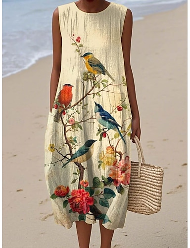 Per donna Abito Midi Abito a Tubino Vestito Estivo Abito a trapezio Vacanza Casual Boho Spiaggia Uscire Vestibilità comoda Grafico Uccello Astratto Senza Maniche Girocollo Giallo Chiaro Estate