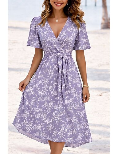 Abito midi elegante da donna abito a trapezio abito avvolto scollo a V maniche corte per uscire vestibilità regolare grafica floreale rosa blu viola verde