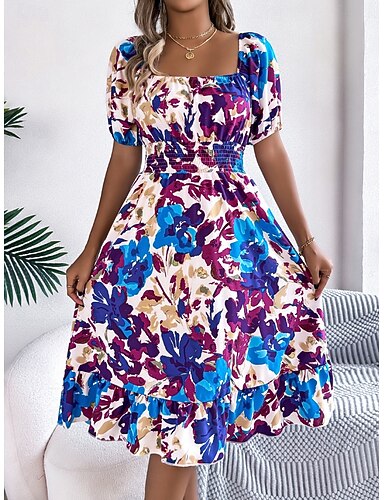 Per donna Abito Midi Abito a trapezio Vacanza Casual All'aperto Uscire Vestibilità regolare Floreale Grafico Manica Corta Collo quadrato Blu Rosso Verde Estate Primavera
