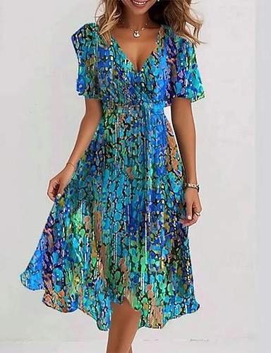 abito midi da donna scollo a V stampa floreale manica corta a trapezio blu comfort spiaggia festa primavera estate moda abbigliamento abbigliamento