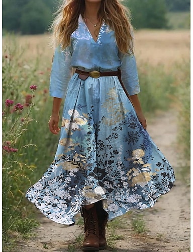 abito casual da donna stampa floreale scollo a V abito lungo maxi abito etnico casual quotidiano vacanza manica 3/4 estate