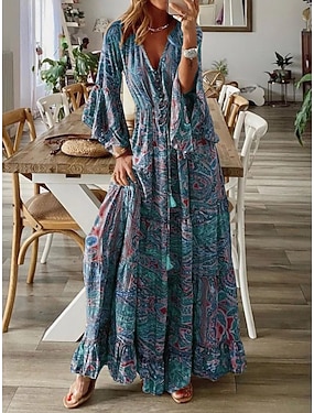 Per donna Vestito maxi Abito casual Vestito svasato Abito linea A Abito boho Boemia Etnico Informale Giornaliero Standard Motivo cashemire Manica corta A V Blu Estate Primavera