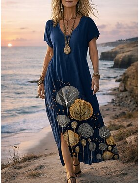 Per donna Abito lungo maxi Abito Boho Vestito Casual Abito a trapezio Abito Stampato Vintage All'aperto Vacanza Weekend Vestibilità regolare Floreale Grafico Manica Corta Scollo a V Blu Estate