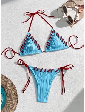 Bikini da donna 2 pezzi con perizoma slim senza schienale abbigliamento da spiaggia per le vacanze colore uniforme collare halter costumi da bagno senza maniche