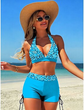 Costume da bagno bikini 2 pezzi donna vita alta senza schiena vacanza spiaggia indossare grafica paisley collo a V senza maniche