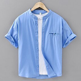 Per uomo Camicia Camicia di lino Camicia popover Camicia Estiva Abbigliamento da spiaggia Tinta unica Vacanza Streetwear Bianco Blu marino Blu Manica Corta Colletto alla coreana Estate Primavera