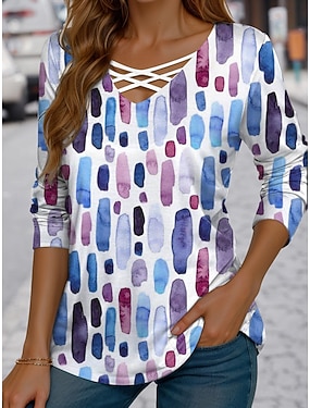 Per donna Maglietta Taglio Stampato Grafico Geometria Vintage Elegante Casual Manica Lunga Scollo a V Top Regolari Quotidiano Blu Giallo Viola Verde Estate Primavera