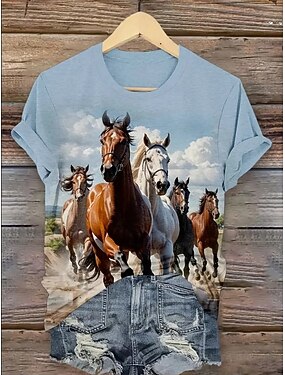 Per donna Maglietta Stampato Grafico Animale Cavallo Vintage Elegante Classico Manica Corta Girocollo Top Regolari Quotidiano Weekend Blu Nero Bianco Blu turchese Estate Primavera