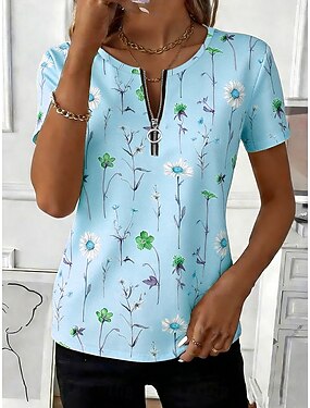 Per donna Maglietta Cerniera Floreale Grafico Piante Elegante Casual Manica Corta Girocollo Top Regolari Quotidiano Sportivo Weekend Blu Giallo Rosa Viola Verde Estate Primavera