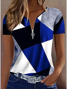 Per donna Maglietta Cerniera Zip a un quarto Grafico Geometrico Astratto Vintage Tropicale Hawaiano Manica Corta Girocollo Top Regolari Matrimonio in Spiaggia Quotidiano Sportivo Blu Nero Rosa Rosso