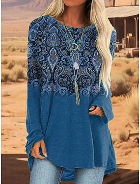 Per donna Maglietta Stampato Grafico Tribale Vintage Elegante Casual Manica Lunga Girocollo Top lunghi Quotidiano Uscire Weekend Blu Viola Verde Cachi Primavera Autunno