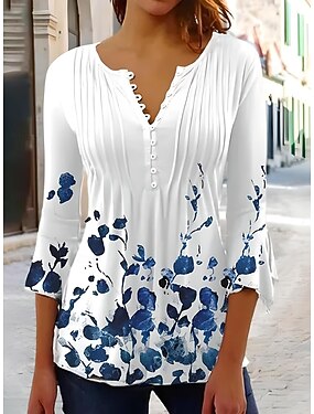 T-Shirt da Donna Ombre Floreale Grafica Elegante Vintage Stiloso Maniche 3/4 Collo a V Top Regolari da Indossare Ogni Giorno Bottoni Blu Rosa Rosso Verde Estate Primavera