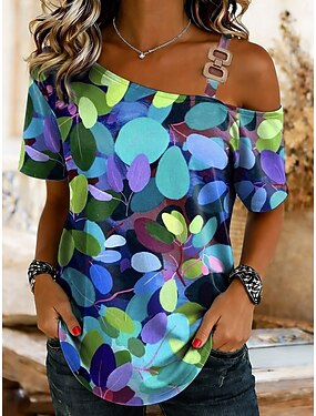 Per donna Maglietta Grafico Piante Vintage Tropicale Hawaiano Manica Corta Monospalla Collo asimmetrico Top lunghi Matrimonio in Spiaggia Quotidiano Sportivo Blu Nero Arancione Beige Estate Primavera