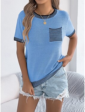 Per donna Top a maglia a coste Maglietta Tasca Grafico Geometrico A righe Moda Elegante Classico Manica Corta Girocollo Top Regolari Quotidiano Uscire Weekend Blu Viola Arancione Verde Cachi Estate