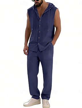 Per uomo Camicia di lino Due pezzi Set Camicia E Pantaloni di Lino Pantaloni Pantaloni casual Impostare Semplice Quotidiano All'aperto Vacanza Con Cappuccio Senza Maniche Estate Primavera Moda Casual