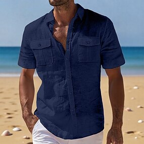 Per uomo Camicia Camicia di lino Camicia Estiva Abbigliamento da spiaggia Camicia cargo Tinta unica Casuale Vacanza Nero Bianco Blu marino Azzurro cielo Manica Corta Bavero Estate Primavera
