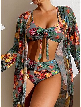 Womens Bikini 3 Pezzo Costume da Bagno Palma Briefs Slim Schiena Nuda Vacanza Mare Wear Floreale Foglie Scooped Neck Senza Maniche Costumi da Bagno