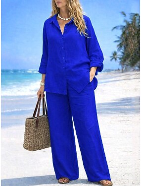 Per donna Set di Pantaloni Bolero Finto cotone e lino Manica Lunga Colletto a Camicia Tinta unica Moda Streetwear Casuale Quotidiano All'aperto Blu Nero Bianco Estate Vestibilità comoda