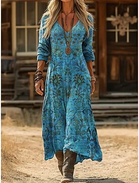 Per donna Abito Lungo Maxi Abito Abito Boho Vestito Casual Abito Stampato Elegante Moda Moderno Quotidiano All'aperto Spiaggia Vestibilità regolare Grafico Manica Lunga Girocollo Blu Rosso Arancione