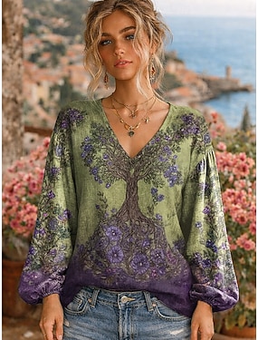 Camicia boho in lino sintetico da donna grafica floreale elegante bohemia vintage a maniche lunghe scollo a V top regolari quotidiano vacanza stampa blu bianco viola arancione estate primavera
