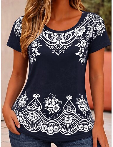 Per donna Maglietta Stampato Floreale Grafico Geometrico Vintage Elegante Casual Manica Corta Girocollo Top lunghi Casuale Quotidiano Weekend Blu Rosa Viola chiaro Estate Primavera