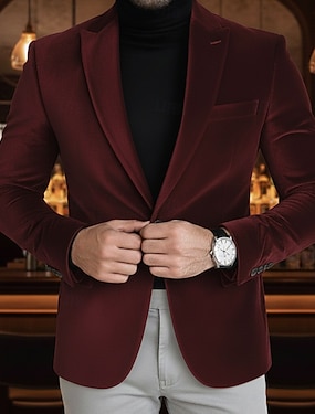 giacca blazer in velluto da uomo, chiusura con colletto, moda classica da ufficio, blazer tinta unita, nero bordeaux viola, vestibilità su misura, monopetto, un bottone