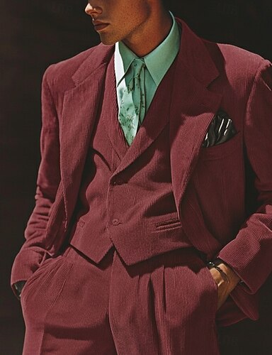Uomo Abito in velluto a coste Affari Matrimonio Borgogna Verde Menta Autunno & Inverno Tuta Bavero classico Affari Formale A righe Vestibilità su misura 3 pezzi Monopetto Due Bottoni