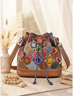 borsa a secchiello in pelle bohémien da donna, design floreale multicolore, versatile, tracolle regolabili, perfetta per l'uso quotidiano casual