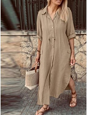 Per donna Abito maxi Finto cotone e lino Abito Camicia Vestito a caftano Vestito Casual Essenziale Casual Quotidiano Vacanza Vestibilità regolare Semplice Manica Lunga Scollo a V Rosa Verde Cachi Blu